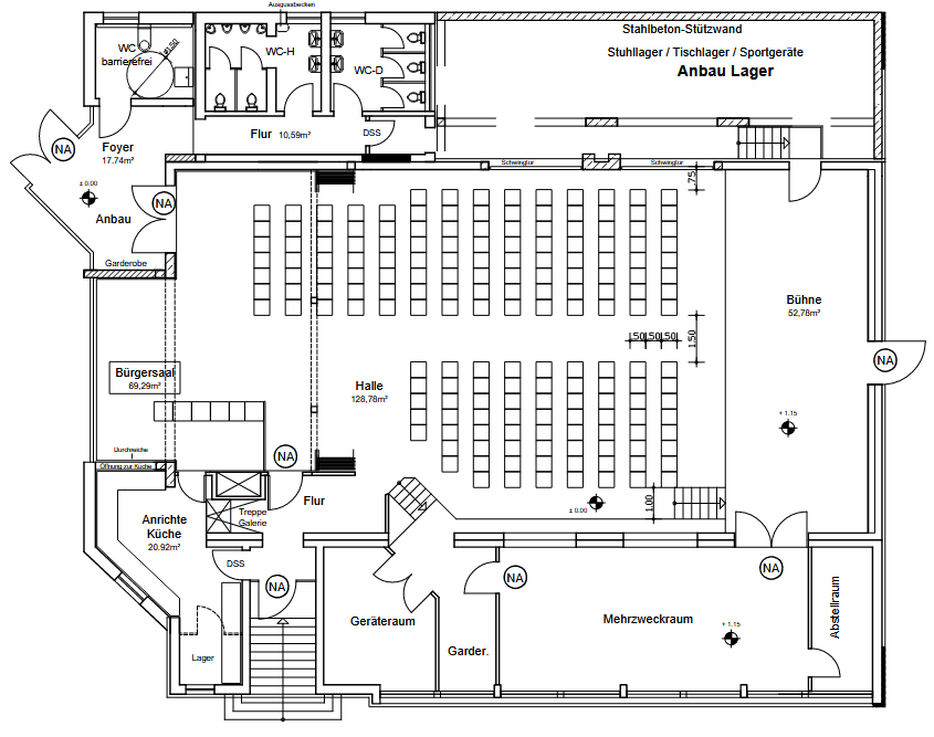 Je nach Veranstaltung ist auch eine Bestuhlung bzw. Tischbestuhlung der Halle sowie die Nutzung der Spiegelwand und der Ton- und Lichttechnik möglich. Bitte sprechen Sie uns diesbezüglich an. Wir freuen uns auf Ihre Anfrage.
